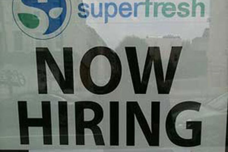 Help-wanted signs appeared Tuesday morning on the glass storefronts of the two-story structure at the corner of Second Street and Girard Avenue, where developer Bart Blatstein built a $30 million shopping center to house a second-floor Pathmark supermarket.