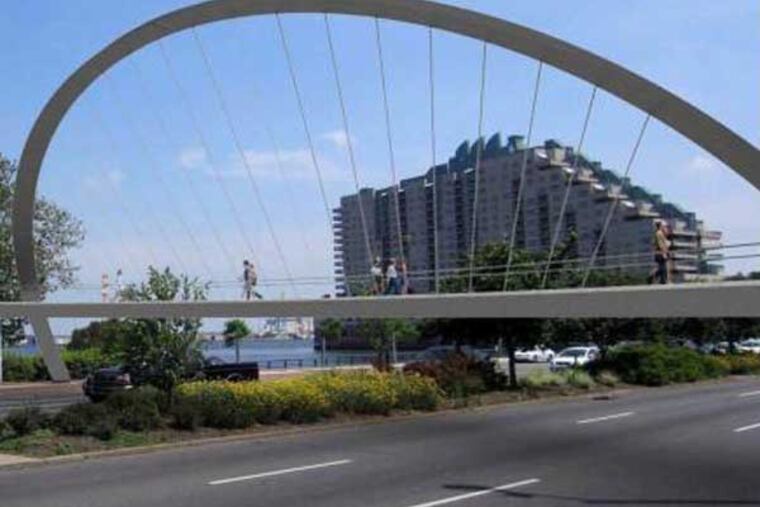 The South Street Pedestrian Bridge would no longer drop walkers off on the west side of Columbus Boulevard. It would span the highway with an arched suspension bridge that would become an iconic gateway, Jones said. A very gradual ramp would spiral down from the raised walkway to The Pier Park below.