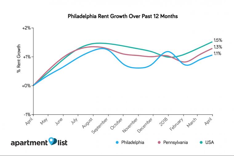 The median rent for a one-bedroom apartment in Philadelphia now stands at $960, while a two-bedroom will generally run about $1,160 each month, according to the market tracker Apartment List. While those rates are basically flat since last month, they do represent about 1.1 percent growth year over year. The state rate of growth is slightly higher at 1.3 percent.