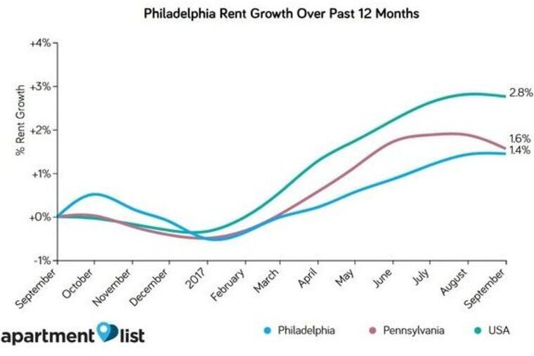 Apartment rents in Philadelphia are flat, compared to last month, but still up over the same time last year.