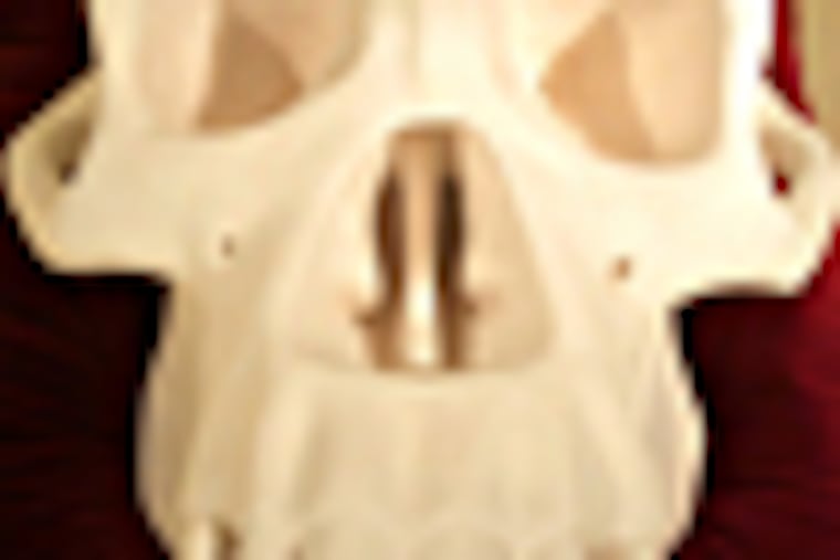 Meiser's white, wall-mounted sculptures of human skulls paired with simian ones are remarkable not just for their large scale and startling resemblance to real skulls, but for the way they're constructed.