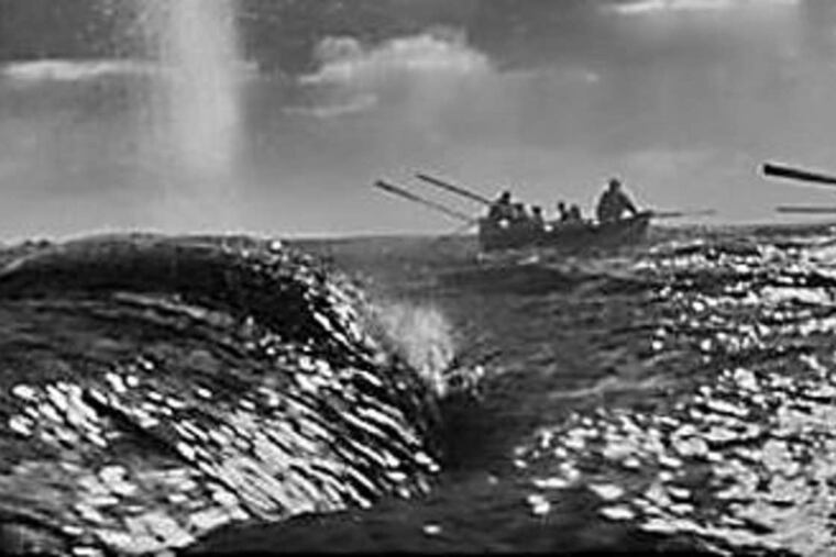 The "white whale" of Melville's story becomes a mottled, gray and white creature in "Heart of the Sea."