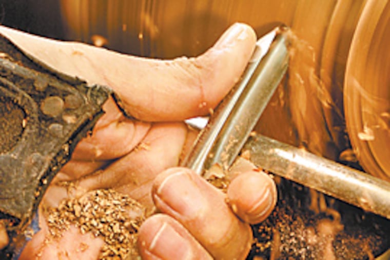 Instead, he heads downstairs to a crowded basement workshop, happily losing himself for eight or nine hours at a pop. Safety equipment on, he slowly turns chunks of green wood on a 300-pound lathe.