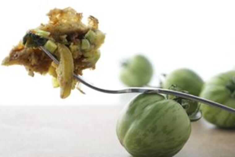 Recently, the Green Zebras in my backyard were on the edge of turning golden between their fetching stripes. That sent me searching for a way to work fried green tomatoes into a light, one-pan meal.