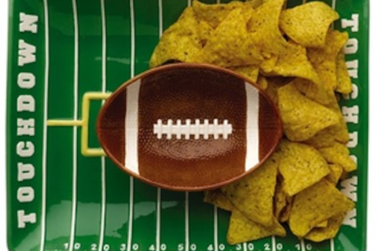 Key matchup For the Super Bowl and every other football Sunday, kick off your game-watching with this kitschy duo. The hand-painted earthenware set includes a 13-by-10-inch football-field platter and a 10-ounce foot-bowl.