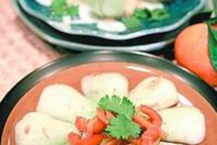 He started with shrimp "tulips" - shrimp puree nestled in the trimmed bases of baby bok choy, then steamed. He used a food processor to puree most of the shrimp, but whipped out a cleaver to show he's perfectly capable of pulverizing shrimp, old-school style.