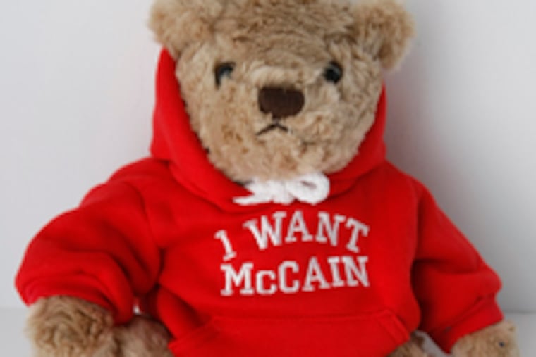 Slocum's biggest sellers are cuddly teddy bears sporting hoodies that read "I Want [Barack, Hillary or, yes, McCain]." Of course, she also offers the standard mugs, buttons and refrigerator magnets that play to the candidates and their parties. Such as her 12-ounce mugs printed with "Friends Don't Let Friends Vote Republican" or "Friends Don't Let Friends Vote Democrat."