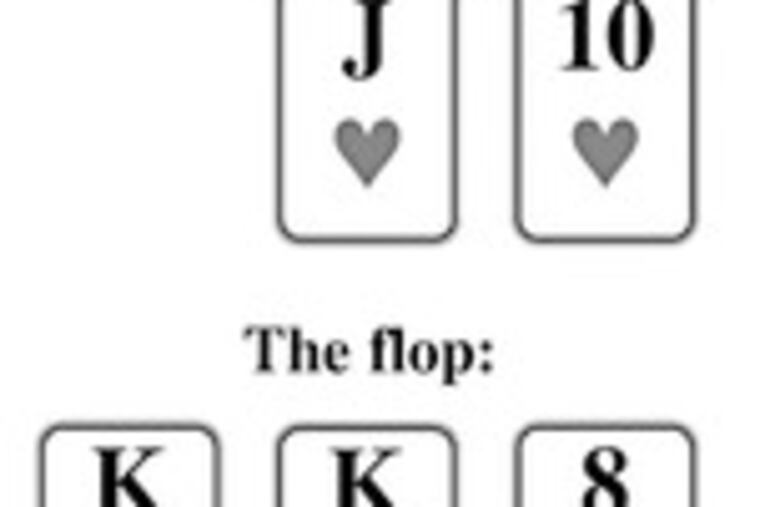 At the 2008 WPT Championship at Las Vegas' Bellagio, with blinds at $100-$200, aggressive young pro Jeff Madsen found J-10 suited in early position and raised to $600.