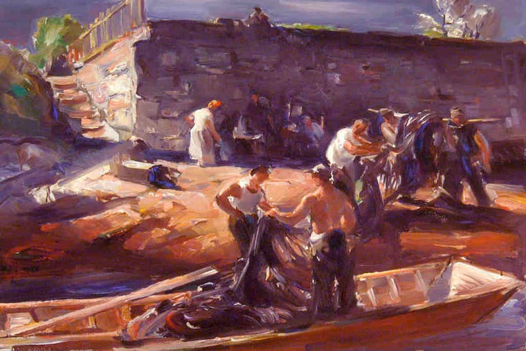 One can feel this in pictures such as Shad Net (Shad Fishermen) of 1938, with its lowering steel-blue sky and crisp whites, and Haul Before the Storm of 1940, which also depicts fishermen on the Delaware River.