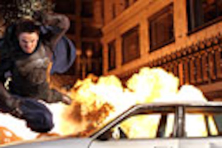 Sorry, Mr. Bill. First, the cop sleds away unscathed on the ripped-off door from the police chief's exploding SUV. Then, he finds himself underneath one of those big pressurized railroad chemical cars when it goes sky-high.