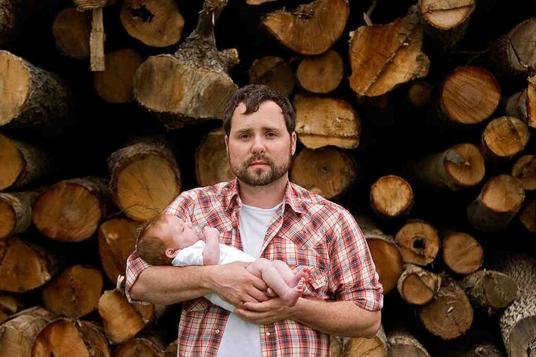 In Burke's photographs, isolated male and female figures are often surrounded by darkness, looking vulnerable or fragile. Men frequently are shown bare-chested, wearing hoods or hats. A self-portrait depicts a fully clothed Burke standing in front of a looming woodpile, cradling an infant. His still lifes, such as an image of a dead deer, seem to be similarly fraught with meaning. You look at these pictures and think of biblical parables and 19th-century New England as seen through a contemporary lens.