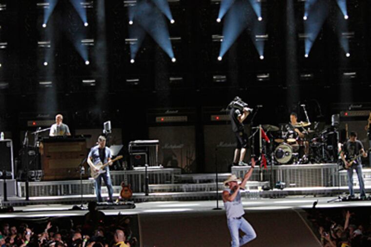 By David R. Stampone FOR THE INQUIRER Another year, another sold-out mid-June Kenny Chesney concert at Lincoln Financial Field — it’s pretty much been a Delaware Valley tradition since 2007. True, in 2010, the pop-country superstar from Tennessee eased off regular seasonal stadium touring, but he did send out his concert movie Summer in 3D to make the rounds, complete with footage from his June 2009 date with Philly at the Linc. Saturday found the 44-year-old singer back in the football stadium with familiar trappings — Chesney beginning his two-hour-plus show from midfield, launched over the crowd on a chair suspended by cables leading him to the stage from above while singing and waving capping another multiple-act bill with some all-hands-on-deck, rock-song covering, and autograph-signing — but there were differences. ... The most important departure was sharing the bill in a near-double-headliner format with fellow behatted big-timer Tim McGraw on their “Brothers of the Sun” tour. McGraw — taller, leaner, and surprisingly tanner than the famously fit and beach-oriented Chesney — preceded his tour mate’s nighttime spectacle with more than 20 songs spanning his career, including the new tunes “Mexicoma” and the already popular set-closing “Truck Yeah.” The show began hours earlier with Jake Owen, still working his breakthrough third album of last August, Barefoot Blue Jean Night, who got things rolling at half past 4 with a set of standard contemporary country fare. The next act, however, shuffled things up. Vermont’s Grace Potter and the Nocturnals thundered through a rock-based performance that nonetheless featured power-ballad moments, mostly drawing from front woman Potter and Co.’s fourth studio album, The Lion The Beast The Beat, just released Tuesday. (Grace Potter and the Nocturnals played a sold-out headlining show Sunday at Wilmington’s World Cafe Live at the Queen.) Potter later joined Chesney for their “You and Tequila” duet, on his previous album Hemingway’s Whiskey, but also featured on his 15th effort, Welcome to the Fishbowl — to come out Tuesday — in a live take from last summer. (Wednesday’s free Chesney show in Wildwood will be shot by Oscar-winning director Jonathan Demme, who filmed the Talking Heads’ 1984 Stop Making Sense and three recent Neil Young documentaries, and “livestreamed” at www.YouTube.com/KennyChesneyVEVO.) There was no surprise appearance by Eagles coach Andy Reid presenting a football helmet to Chesney, as there was last year, but the athletic crooner thanked the team for use of their workout facilities earlier in the day (and the stadium). In the encore set, McGraw reappeared after high-fiving his way through the crowd to do his hit duet with Chesney, “Feel Like a Rock Star,” also on Welcome to the Fishbowl. After the stars traded vocals on Chesney’s “She Thinks My Tractor’s Sexy” and McGraw’s early single “Indian Outlaw,” the evening wrapped with an extended version of Jackson Browne’s “Running on Empty.”