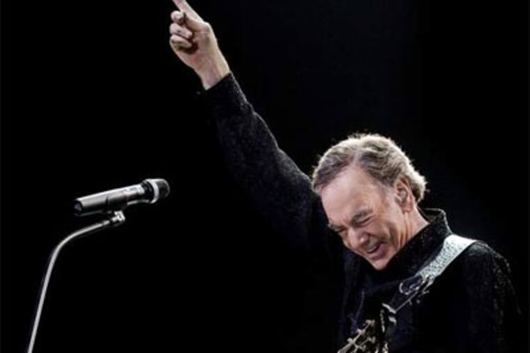 Neil Diamond was breathing hard. The air inside the Wells Fargo Center on Monday night was fairly temperate, but the 71-year-old performer was working up a sweat making sure that even those in restricted-view seats got an eyeful. "I bet they told you these were front-row seats," he said, turning his back on the arena to face the people seated on the extreme right, almost behind the stage. But then, he allowed, it wouldn't take much for him to come back front and center, or indeed, to turn his attentions anywhere. "Basically," he said, "I go where there is noise."Noise there was, and plenty of it. Diamond has been on the road so long, visiting Philadelphia since "19-oh-forget-it," that working the crowd is second nature. And the crowd was ready to be worked, rising to their feet at his command and busting out the call-and-response refrain to "Sweet Caroline" as if they'd done so hundreds of times before — which, of course, they had. Although Diamond dove into a lengthy reminiscence about spending his first big royalty check on a warm coat — a story told on countless occasions — his greatest-hits tour wasn't overly concerned with nostalgia. The audience provided that, deriving as much from their own re-creation of past joys as from the live performance in front of them. (It's no wonder Diamond is a karaoke-bar favorite.) The arrangements of Diamond's songs have expanded over the years, often becoming sprawling and unwieldy; the trouble with touring in front of a 14-piece band is that he evidently feels the compunction to use it on every song. The impassioned "Shiloh" benefited from the quasi-orchestral swell, but "I Am … I Said" was buried in bombast. Diamond's voice has hardened with age, and he often gave in to the temptation to over-sing, as if trying to reach the top tier without the aid of a microphone. No wonder he was sweating.