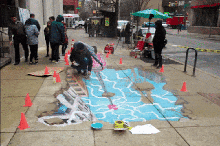Richards, who designed the artwork, reached out to Alysia Mackenzie, a graduate of the University of the Arts, to help fine-tune the design. They extended it on a computer and angled it into a grid before taking to the sidewalk. After chalking the design, the two artists began filling it in with a mixture of chalk and paint, adding dimension.