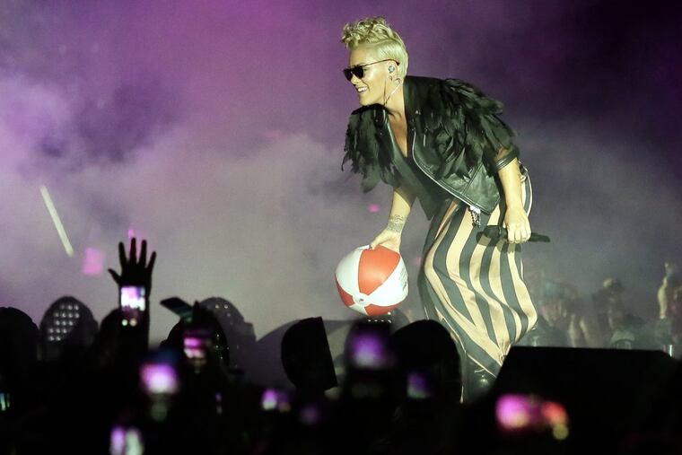 On the Atlantic City beach Wednesday night, as a part of the 2017 Atlantic City BeachFest Concert Series, and her only East Coast performance, Pink made her return to the area for the first time in over four years (in between, she had a son and released an album as one half of the folk duo You+Me). Over 45,000 fans, some with similarly cropped platinum and rose-hued hairdos as the star, crowded to capacity on the beach, upward of five blocks away from the stage, to get a view of the three-time Grammy winner as she belted hits from her six-album repertoire. If you didn't stake your claim to a plot on the sand prior to showtime, you weren't admitted past security.