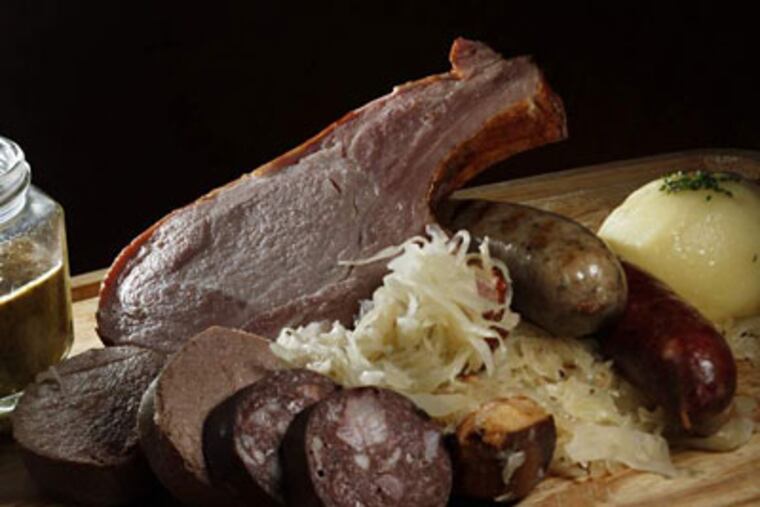 In the Brauhaus kitchen, beer is a staple ingredient. His schlachtplatte, a hearty, heaping plate of sauerkraut and smoked meats, is steeped in German lager and seasoned with caraway, juniper, and bay leaves. "It's so important to match the flavor of the beer to the ingredients you're cooking," says Nolen.