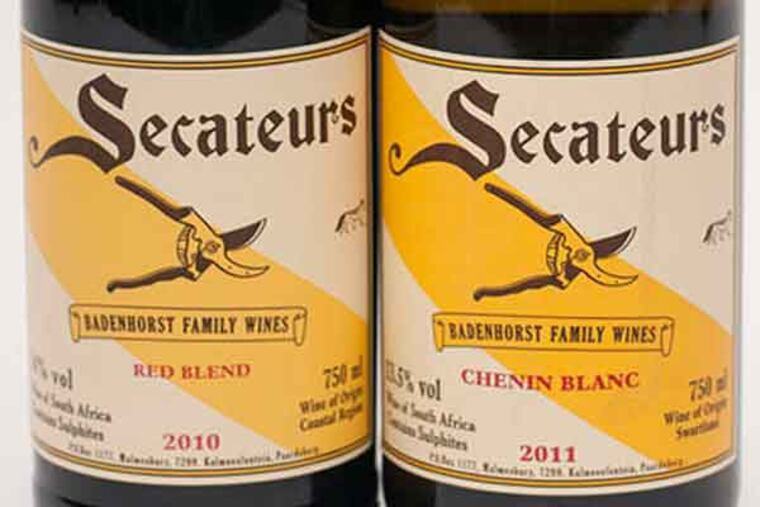 A.A. Badenhorst Secateurs 2011 Chenin Blanc Swartland (code 38986) and 2010 red blend (38988), $14.99 in select suburban State Stores. Also poured at the Mildred, Tashan, Savona, and Rouge. Winemaker will be at Zahav Friday for a special dinner, and at Tria's Wine School Saturday. Also available online at finewineandgoodspirits.com.
