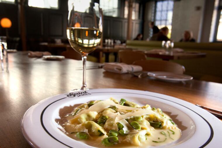 Fava and ricotta ravioli starter, $8, the Saint James, Suburban Square Ardmore. Information: 610-649-6200; saintjamesphilly.com.