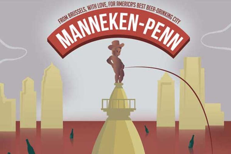 For the third year, Philly Beer Week sent a local brewer to Belgium to collaborate on a one-off, and for the third year he came back with something different. This year it was Chris Wilson, of Weyerbacher, and Tom Peters, of Monk's Cafe, traveling to Brasserie de la Senne to produce what is being described as a "Belgo-American Dubbel." I'm not sure how it's going to taste, but you have to love the label depicting Brussels' famed Manneken Pis sculpture taking a whiz atop City Hall.