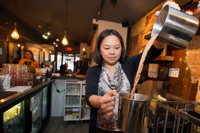 It's a primal call. And the magnetic pull of it draws me through the old glass storefront of a former East Passyunk Avenue shoe store, past the big counter up front where someone pours coffee from cup to cup in long arcing streams, and past the street scene murals and exposed brick walls artfully patched with distressed plaster.