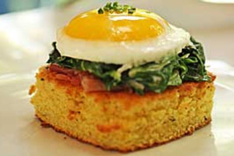 And great cured sausage from Surry County, Va., lends just the right switch of country swagger to a sophisticated roulade of chicken stuffed with pears and cornbread. Paper-thin shavings of velvety Wigwam ham add a salty luster to the sweet cornbread pedastal topped with creamy collards and a sunnyside-up egg which, when broken, becomes a sunny sauce.