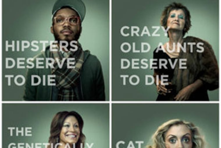 Posters featuring a young man with geeky glasses and a plaid scarf popped up across the country. "Hipsters deserve to die," they read. "Cat lovers deserve to die," read another.