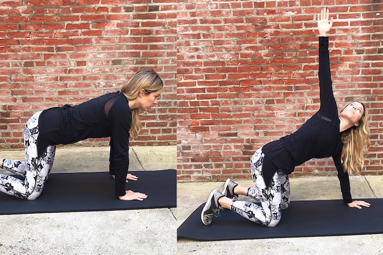 Try to keep your hips square with the floor as you elevate your right arm and rotate it up toward the sky. Allow your gaze to follow your arm as it moves.