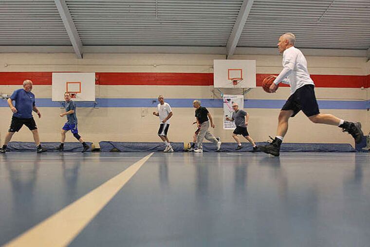 The team still plays outdoors at a full-length court in Gladwyne in the fall and spring (they take summers off). In the winter, they seek the shelter of the Bala Gym, where the court is about two-thirds the length of a standard court (hence, no three-point line). About 15 men participate in the association, including four original members.