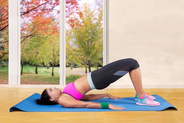 Lie on your back, bend your knees and position your feet about shoulder-width apart. Raise your hips as high as possible off the floor while keeping your knees over your toes. Repeat 15-20 times.