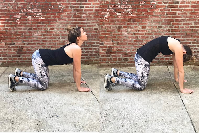 Hold for two counts. On the exhale, drop your spine into a "U" shape and lift your chin off your chest, directing your gaze upward. Continue this sequence for 20 repetitions.