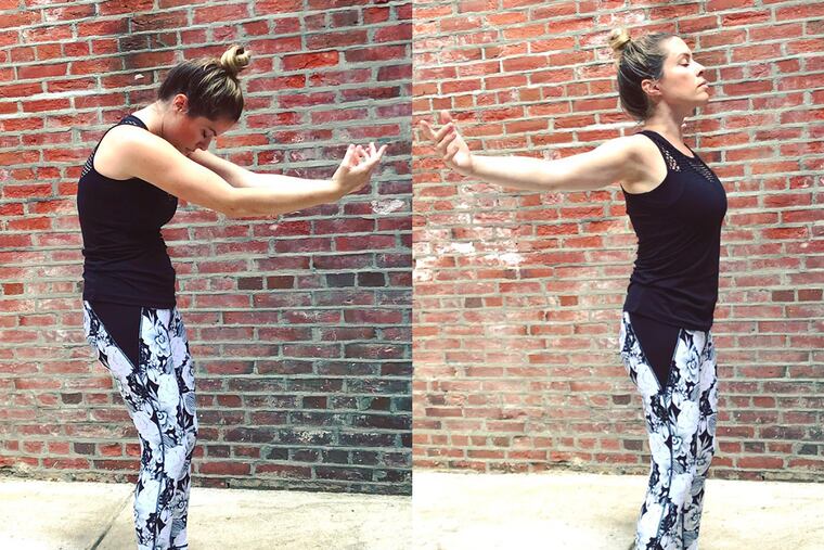 Gently lift your arms in front of your body until they are about shoulder height. Keep your elbows soft. Take another deep breath as you open your arms wide enough to feel a deep stretch in your chest, ribs and inner arms. Hold for two counts then exhale, bringing your arms back in toward each other. Allow your shoulders and upper back to curve inward. Repeat five times.