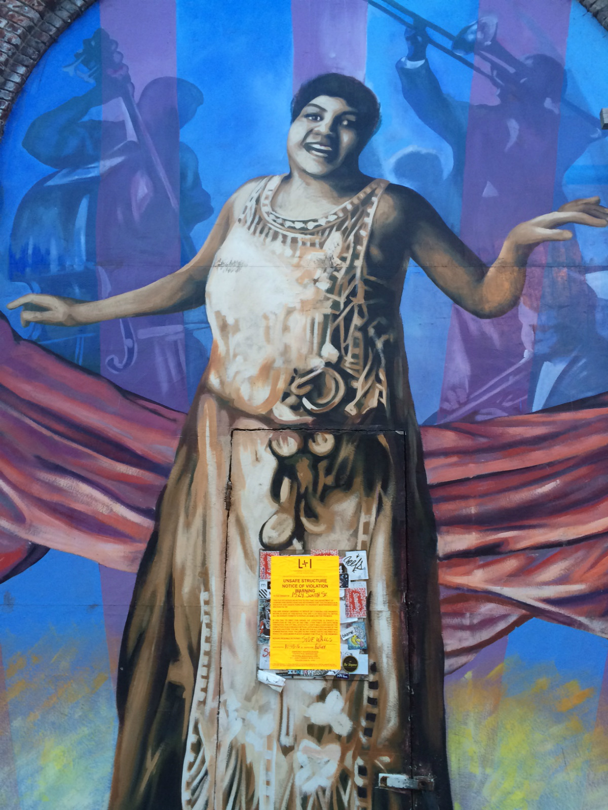 A notice is plastered over an 11-year-old mural on the Royal Theater on South Street. It notes the structure, which has been slated for renovation, is unsafe. (SAMANTHA MELAMED)