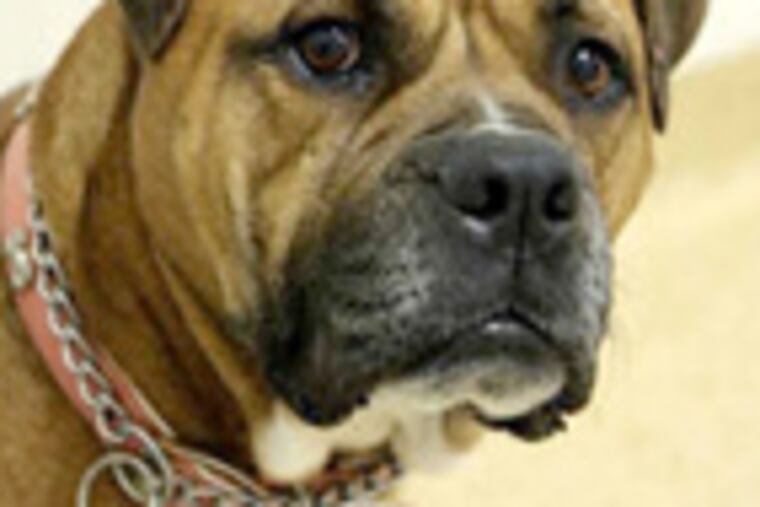 This week's Adopt-a-Pet at the Philadelphia Animal Welfare Society is June Bug, a 4- to 6-year-old Olde English Bulldogge/boxer mix.