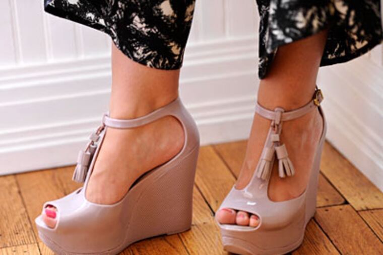 "My jelly wedges are seriously the most comfortable high heels I've ever worn," said Karin Tyburczy, owner of Astro Vintage in Queen Village; she owns four pairs of Melissa wedges. Tyburczy never thought she'd be wearing jellies as an adult, but the 31-year-old is hooked on the shoe for trend and comfort. "I would throw out all of my heels in favor of these shoes. They are heat moldable so there is no rubbing on my toes at all."