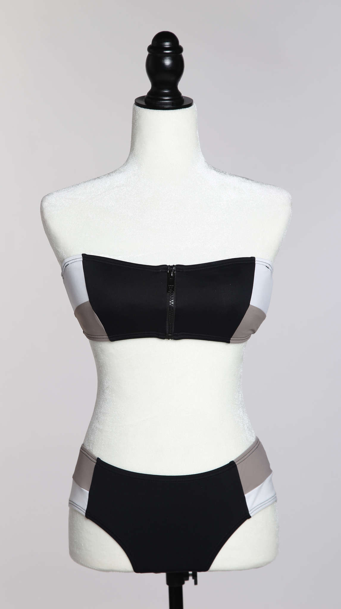 And then there are the bikini tube tops that feature the same zipper details you'd see on a hoodie, and full-cut bottoms with skirts, much like those worn by runners. In the end, your swimwear can be worn at yoga, on the beach - or at yoga on the beach.