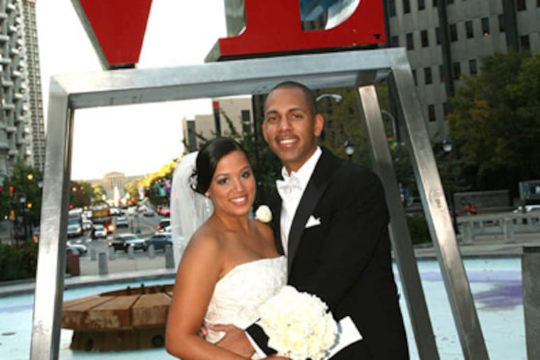 The new date also meant the couple was able to wed on the Constitution Center's terrace, overlooking Center City, at sundown. The modern terrace and the historic view were the perfect blend of their tastes, they said.