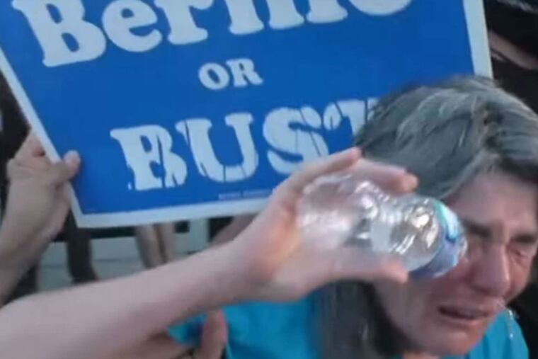 Among the people hit by the spray is Anna Marie Stenberg, 69, a pro-Bernie Sanders protester from California. After being hit, she immediately turns from the fence and begins pouring water out of a bottle onto her eyes.
