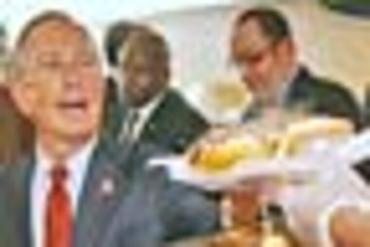 The two went into the Fresh Grocer for cheesesteaks. Bloomberg asked for hot sauce. What kind of cheese? "Not Swiss," he said, a reference to John Kerry's faux pas in 2004 presidential campaign.