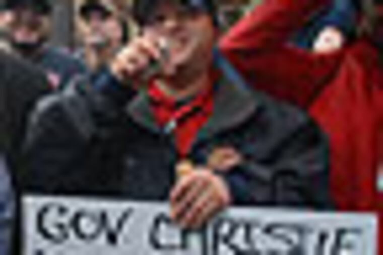 TRENTON - Thousands of people are rallying in the rain at the New Jersey Statehouse this afternoon in solidarity with public-union employees in Wisconsin and to protest against Gov. Christie's proposals to scale back benefits for government workers.