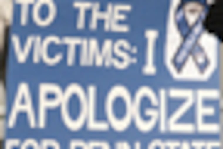 Reminders of the scandal were everywhere. In a parking lot, a Penn State flag flew at half staff. A plane flying overhead pulled a "Pray for the Kids, Not the Cowards and Liars" banner.