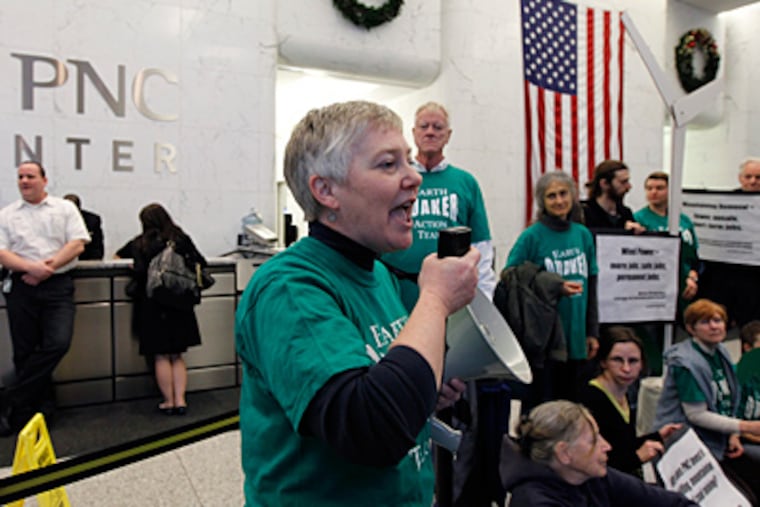 In another protest Tuesday, five of 30 people from the environmental group Earth Quaker Action Team, who staged a morning protest in the lobby of the PNC Bank building at 16th and Market Streets, were arrested for refusing to leave the building.
