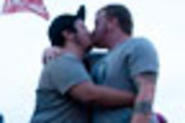 At the Chick-fil-A on Columbus Boulevard, same-sex couples and supporters of gay marriage traded smooches in front of TV cameras to the bemusement of some customers.