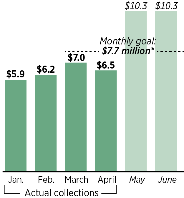 The city brought in $5.9 million in January, $6.2 million in February, $7 million in March and early returns show $6.5 million in April.