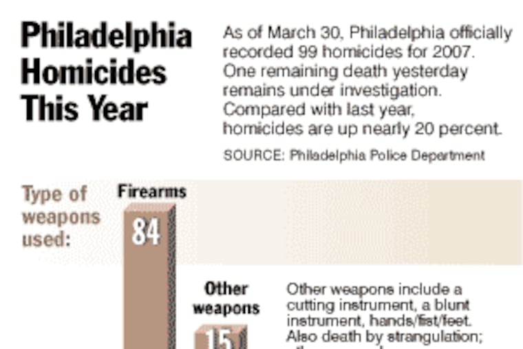 When the summit broke up yesterday afternoon, the tally stood at 98. Late last night, a 99th victim died in a shooting in the 2800 block of North Ringgold Street in North Philadelphia in which two other people were wounded, one critically. With another earlier shooting death yesterday under investigation, the city's total could actually be 100.