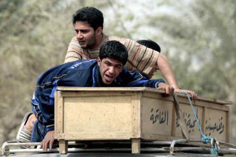 By afternoon, there was little sign of the attack, save for the shattered glass that littered the asphalt. A tattered poster left over from January's municipal elections hung from a bridge pillar. "With the blood of our martyrs, Iraq is liberated," it read.