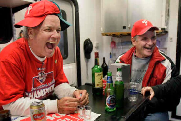 Lavin, the accountant, tailgates with 16 of his best friends, many of them former classmates from back in the day at La Salle College High School. The leader of his group is Jim Convey, 37, who not only would be going to the Eagles game in the afternoon, and tailgating through the Phillies last night, but would be back early to tailgate and attend World Series Game 5 tonight.