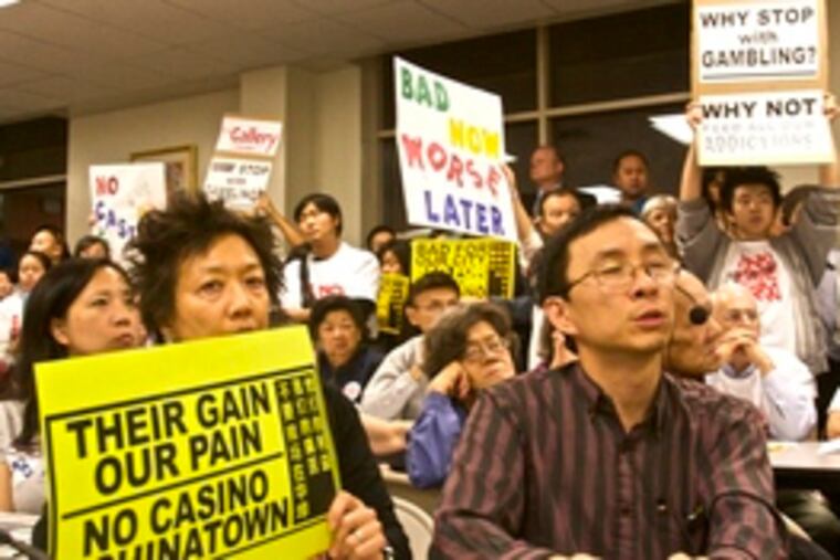 Casino protesters lined the school cafeteria and held signs with messages like, "Bad for our kids, bad for Chinatown." Some spoke in Cantonese.