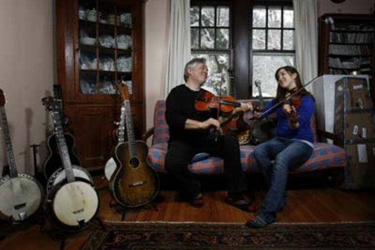They grab their fiddles to make the point. Facing each other on a couch, they treat an audience of one to "Shove That Pig's Foot a Little Further Into the Fire," a late-19th-century tune.