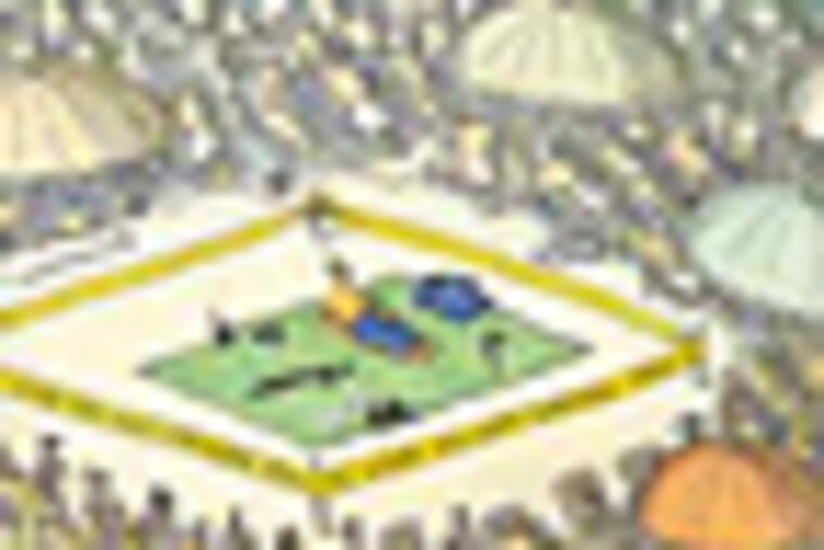 Musicians and musical instruments are a frequent theme, as is baseball. (In one cartoon, a giant windshield wiper dries the field.) But aside from an occasional beach setting - as in the one where a sunbathing cop has cordoned off a precious piece of sand - the impact of lifeguarding on O'Brien's art is mostly indirect.
