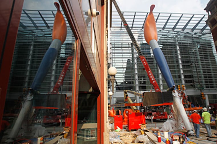 The man who brought Philadelphia the Clothespin sculpture in 1976 sat in the shade of the Convention Center Saturday as his latest work, a 12,000-pound uplifted paintbrush, came together across Broad Street.